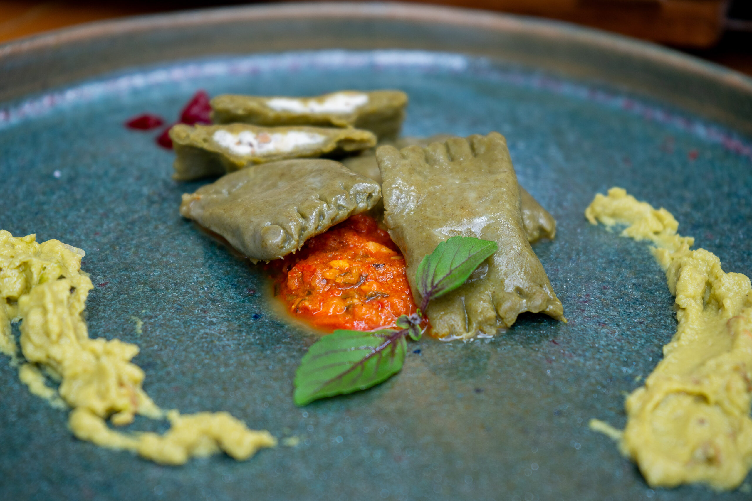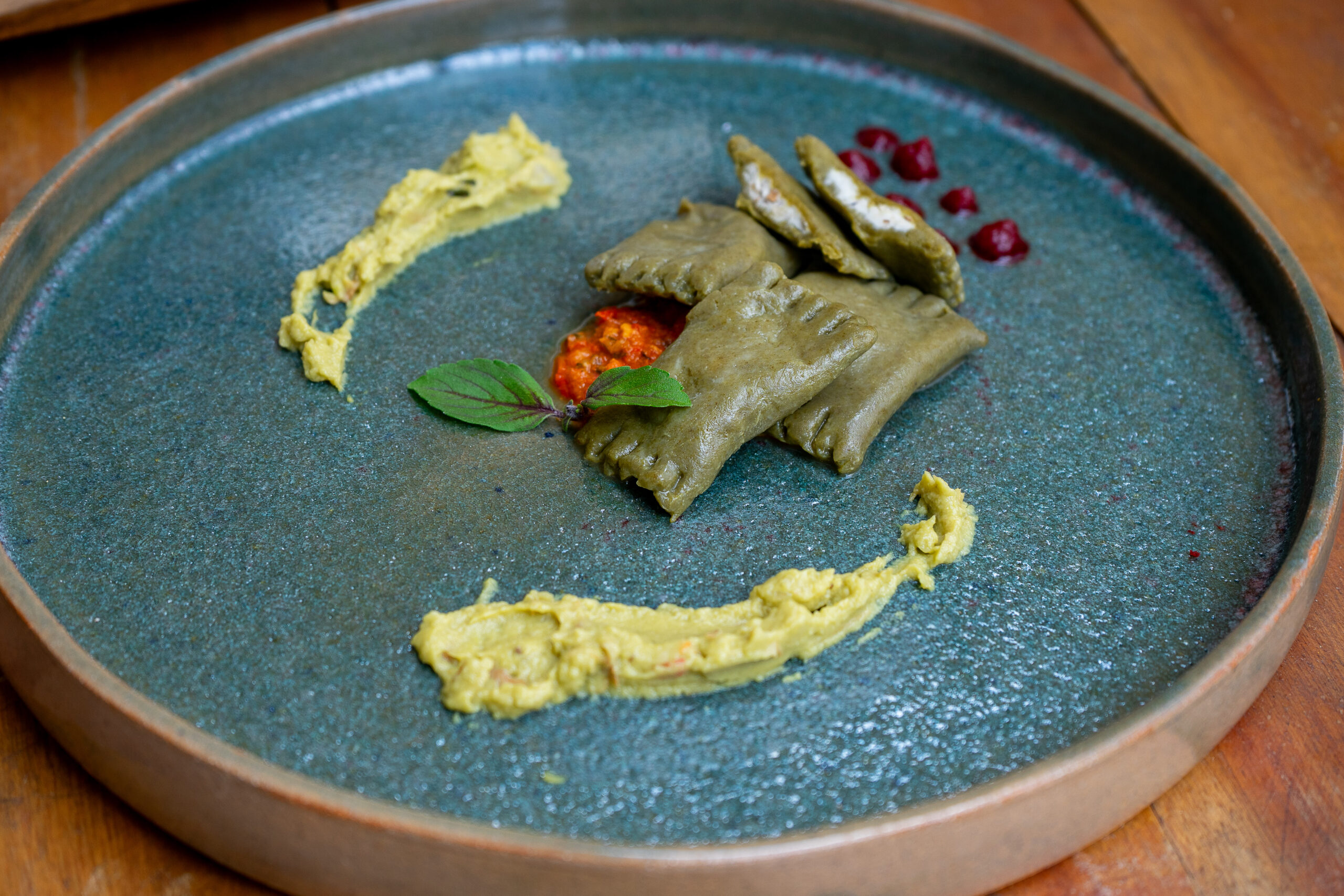 Ancho de Angus e Agnollotti verde queijo cabra e pesto de nozes