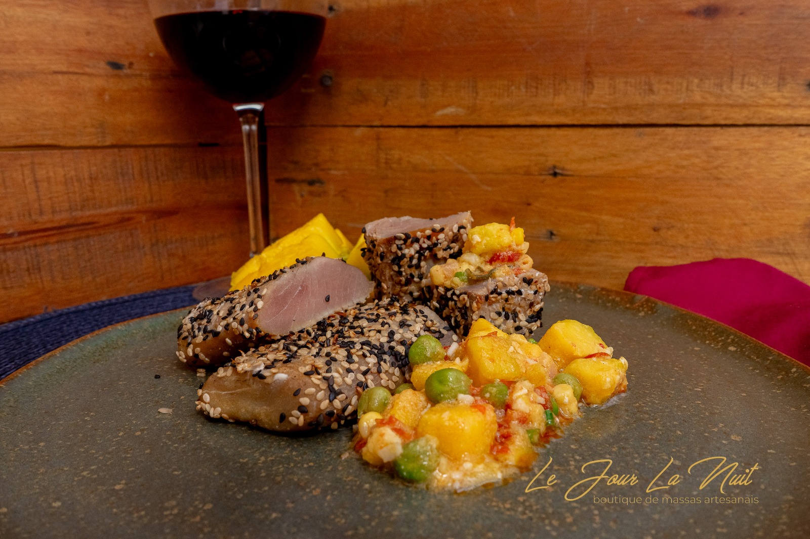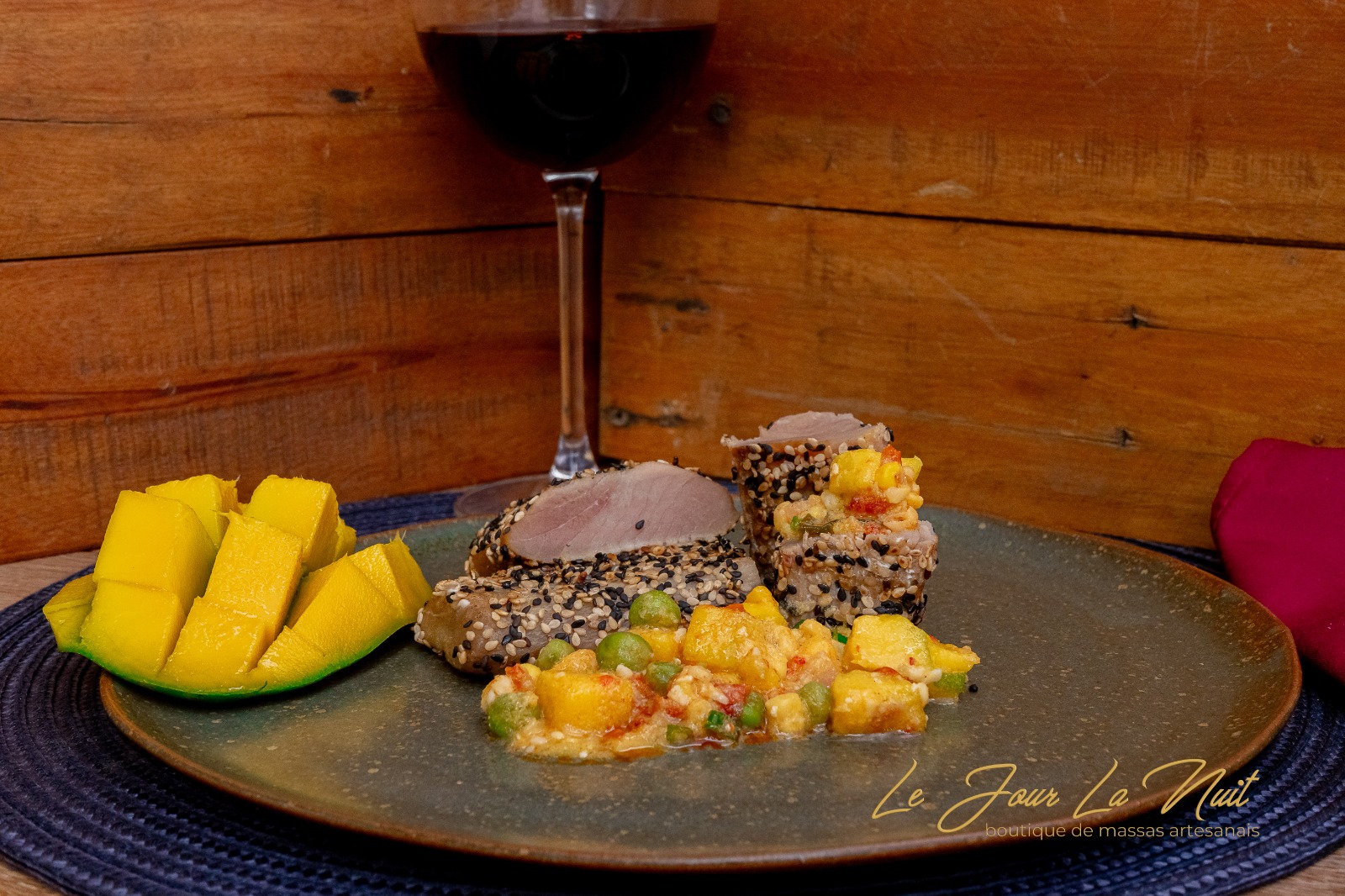 Atum fresco e suculento, harmonizado com um sucotash de milho e cogumelos, trazendo uma mistura de texturas crocantes e macias. O guisado de milho e tomate adicionam um sabor doce e leve, enquanto o molho de leite de coco com manga traz uma cremosidade tropical, com um toque exótico de gengibre e alho, que intensifica os sabores.