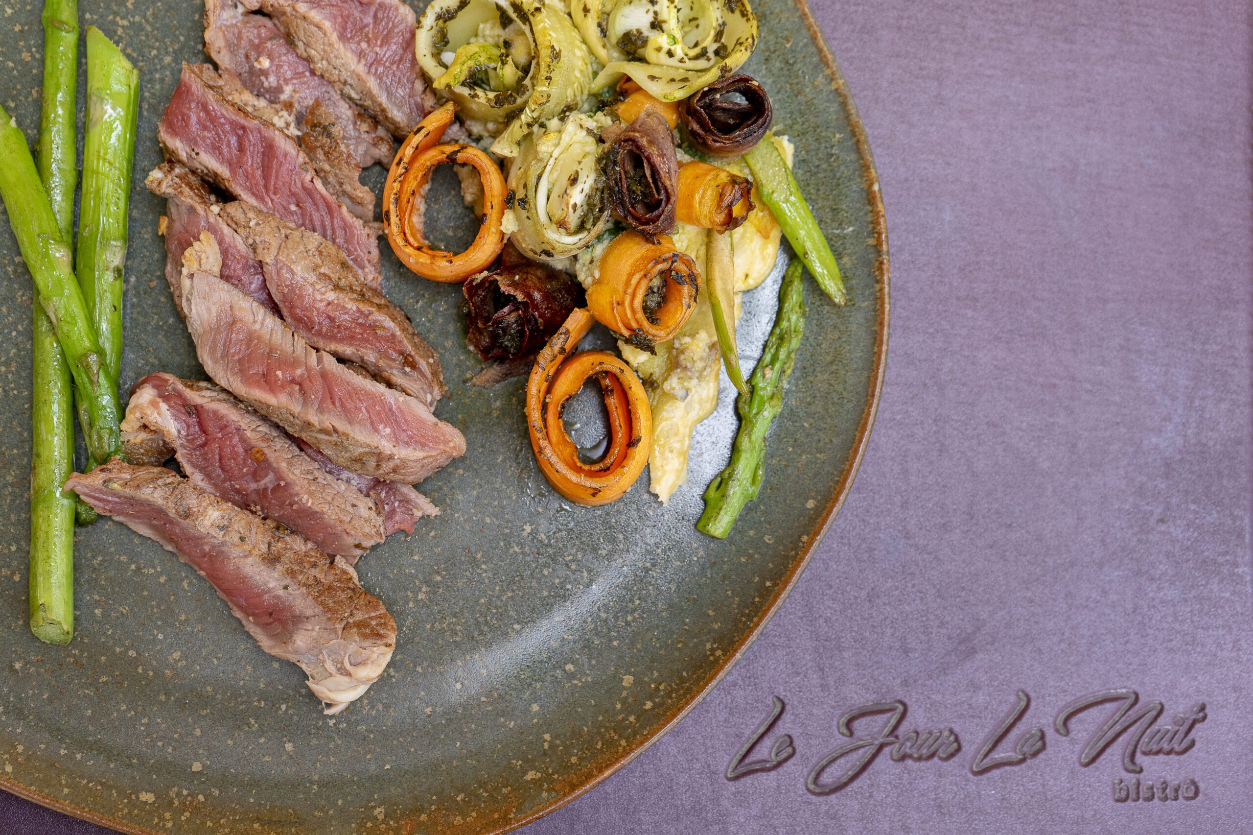 Carne macia salteada lentamente com vegetais frescos e aspargos crocantes.