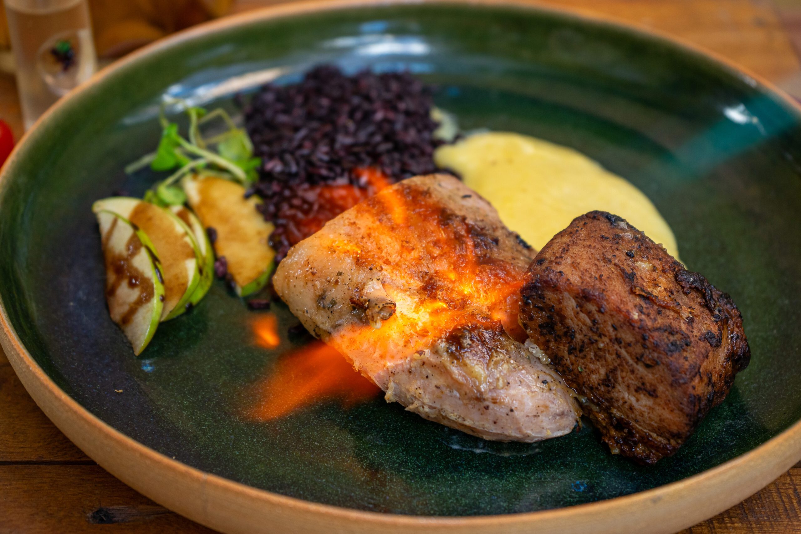Filé mignon cozido sous vide e defumado, servido com legumes no vapor e arroz basmati com castanhas e caju. Um prato sofisticado, com carne macia e sabor defumado, acompanhado de legumes frescos e arroz aromático com crocância.