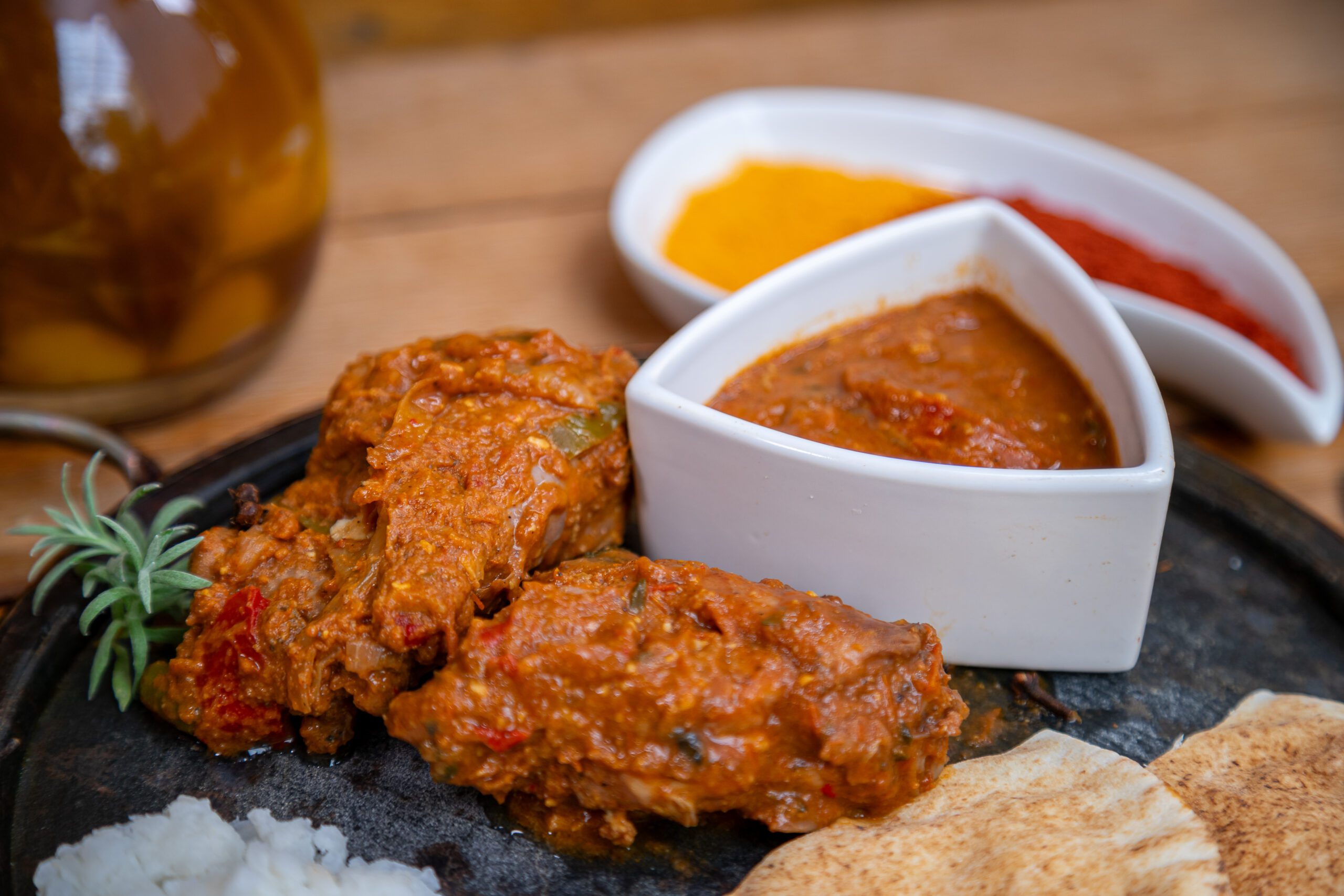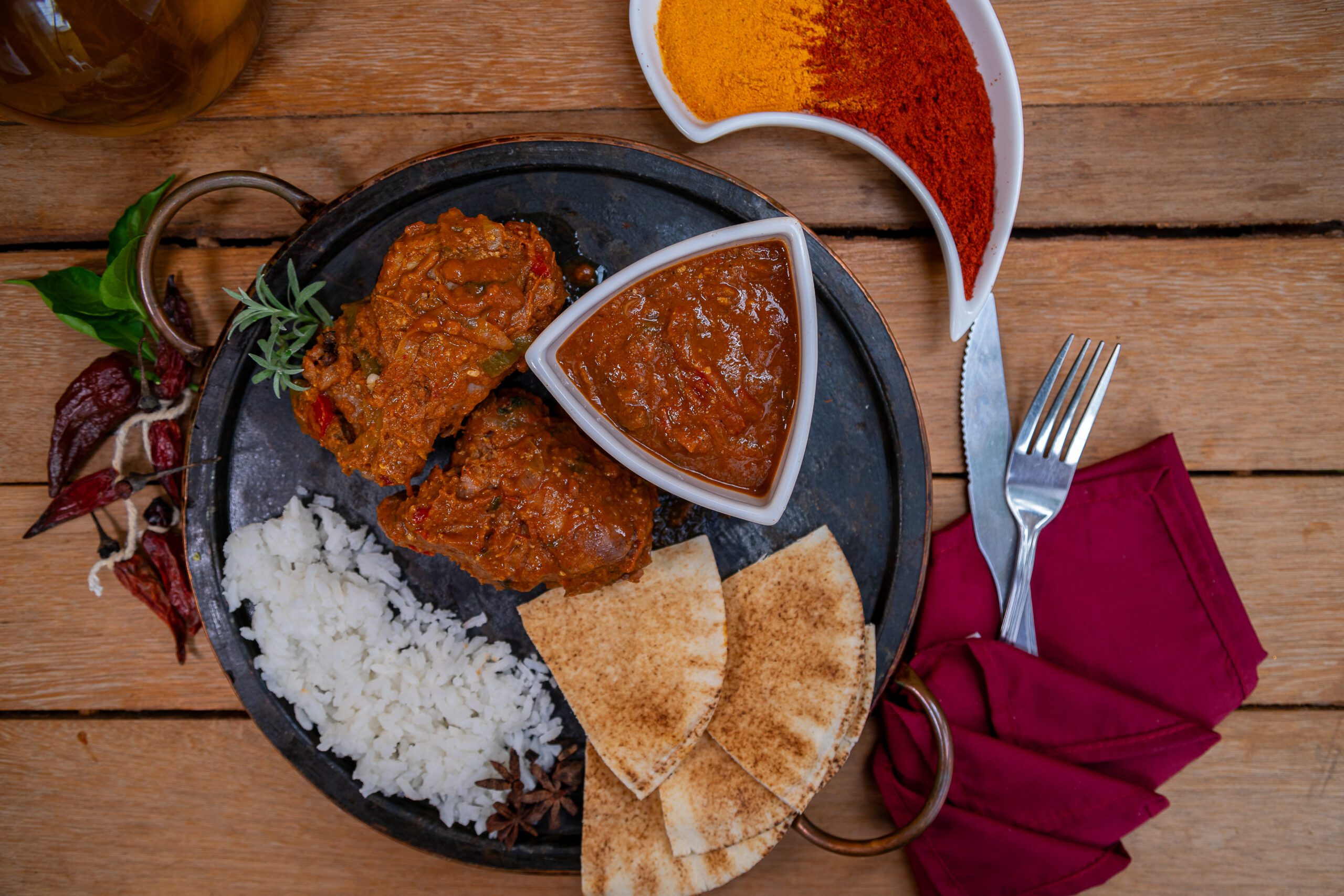Frango indiano ao curry, com molho realçado por uma mistura de especiarias, acompanhado de arroz basmati, leve e perfumado, criando uma combinação de sabores intensos e exóticos.
