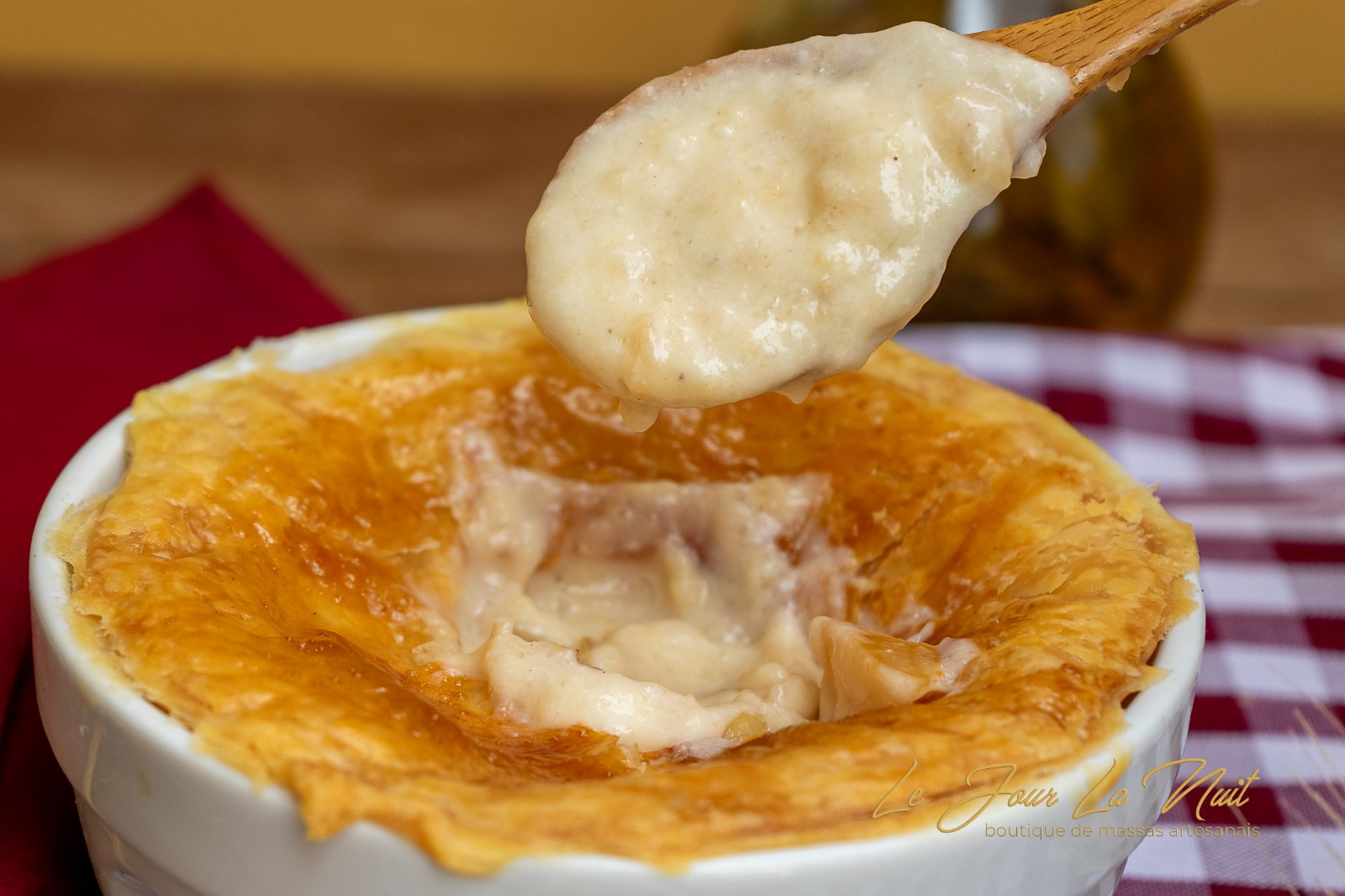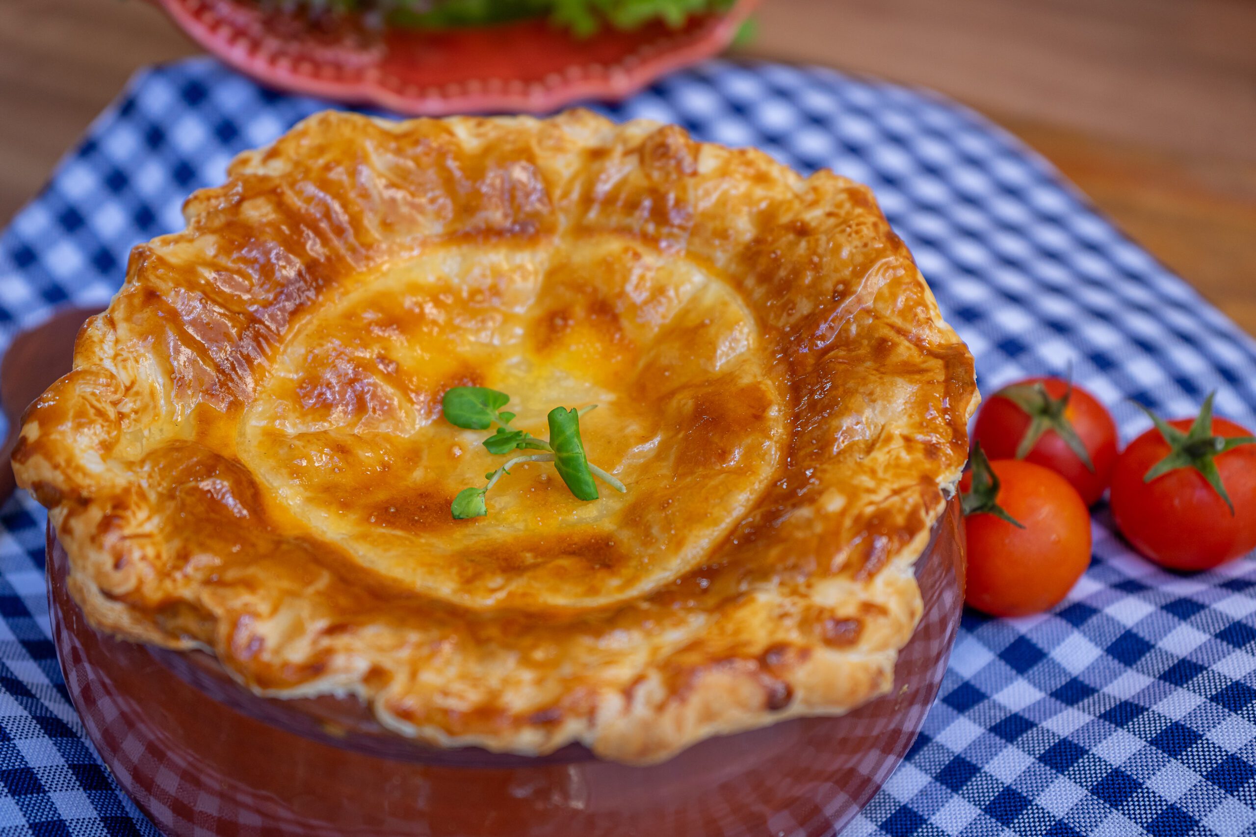 Um pot pie gourmet com recheio cremoso de queijo de cabra, toque doce de manteiga de maçã, nozes crocantes e ameixa branca. Sabor delicado, envolto em massa leve e amanteigada.