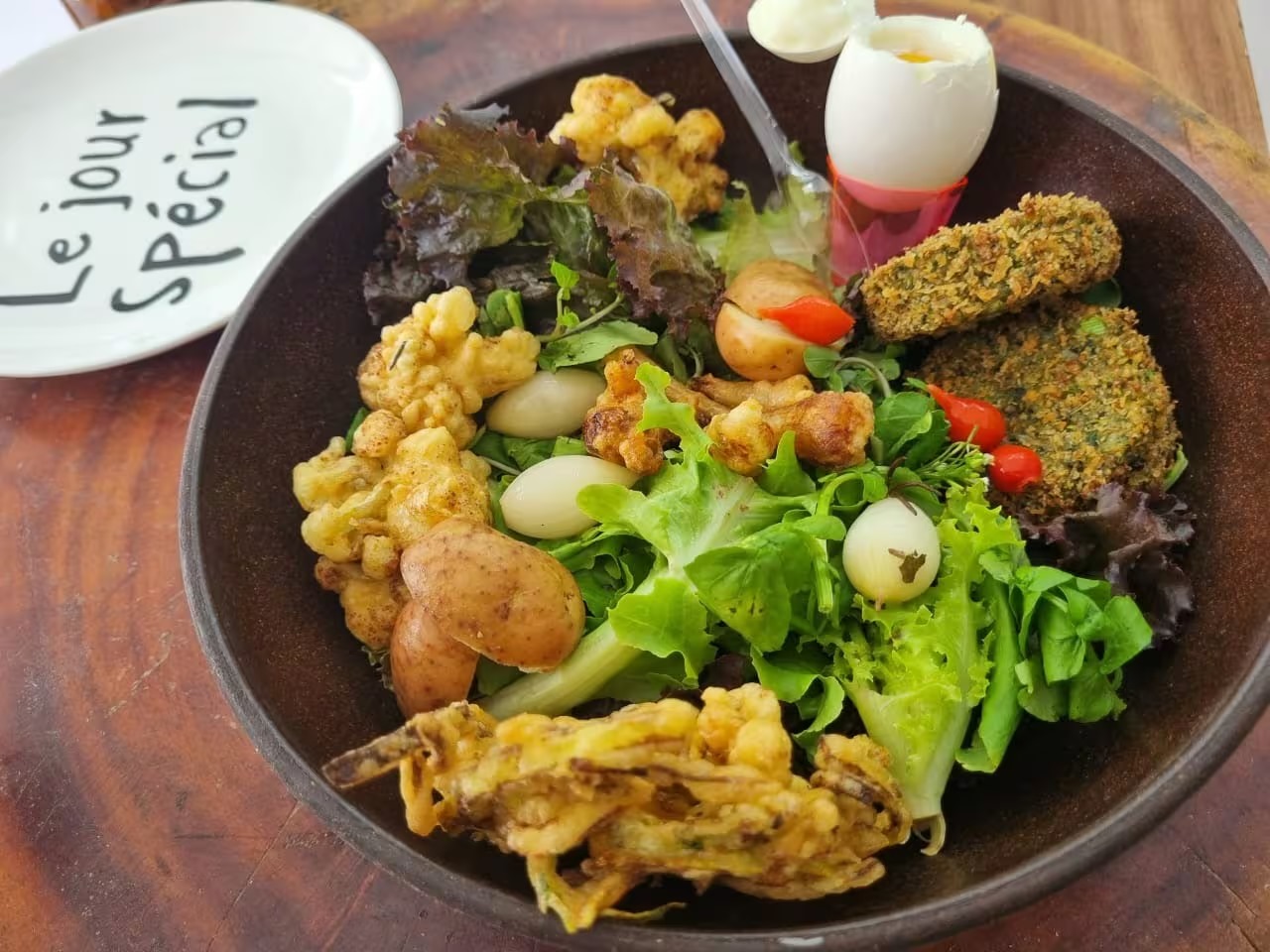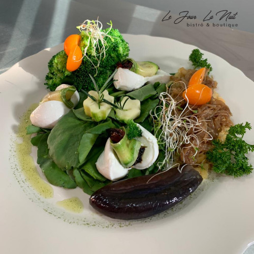 Arroz com lentilhas e cebola caramelizada, servido com shinitzel de peixe crocante e acompanhamentos vibrantes: homus de beterraba, repolho, cogumelos, ovos de codorna, mini cebolinhas flambadas na romã, avocado, pickles de pepino e berinjela ao alho, folhas verdes e pimenta biquinho. Um prato completo, colorido e cheio de sabor!