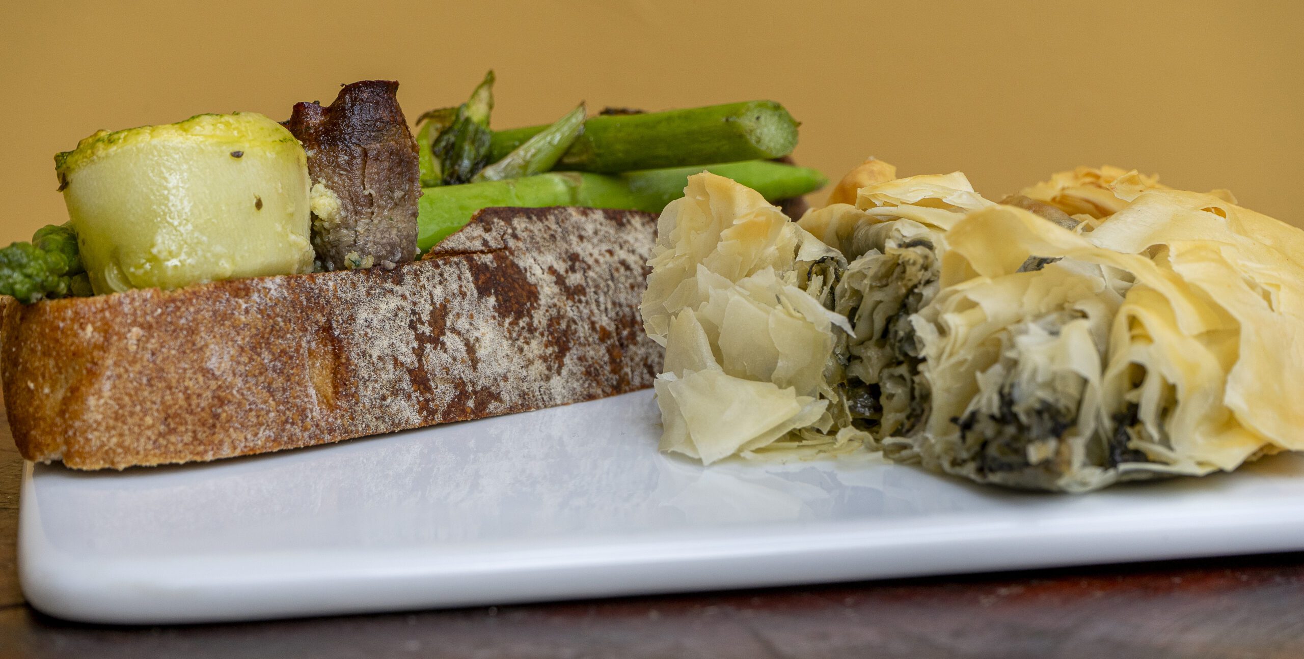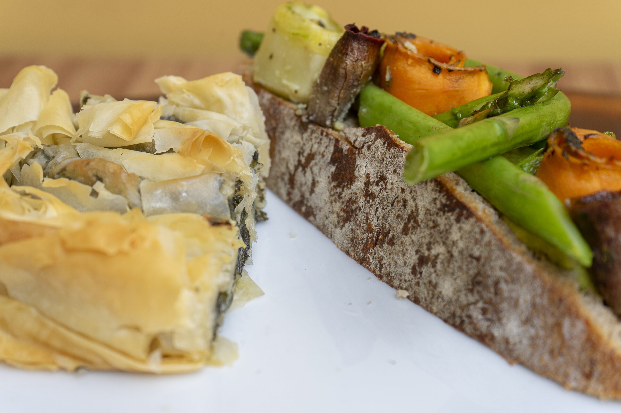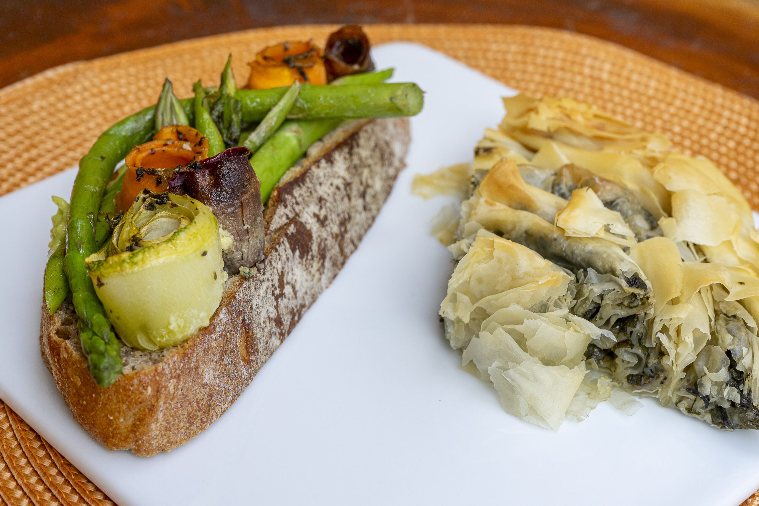 Tartines delicadas com aspargos grelhados, vegetais e toque de spanakopita.